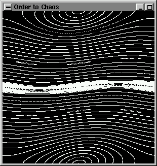 • En ../../common/January1998/../../common/January1998/example2.c puedes añadir colores a cada punto. Por ejemplo, una código de color muy interesante sería asignar a cada punto un color según la estabilidad local de la órbita (Physics Review Letters Vol 63, (1989) 1226), cuando la trayectoria va hacia una región caótica, se vuelve más roja, por ejemplo, mientras que islas casi estables son más azules. Si haces este efecto, se verá más clara la naturaleza fractal de la transformación de nuestro ejemplo. Es un poco avanzado para aquellos de vosotros que no hayais hecho nada de ecuaciones diferenciales, pero es interesante aprenderlo si quereis aprender cómo utilizar transformaciones y fractales en vuestros gráficos por ordenador.