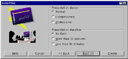 ÇÁ¸®Á¨Å×À̼ÇÀ» ¸¸µå´Â ¹æ¹ý¿¡´Â µÎ°¡Áö ¹æ¹ýÀÌ ÀÖ´Ù. : óÀ½¿¡ ºñ¾î ÀÖ´Â ÇÁ¸®Á¨Å×À̼ÇÀ¸·ÎºÎÅÍ ½ÃÀÛÇϰųª µµ¿ì¹ÌÀÎ ÀÚµ¿ Ç×ÇØ»ç(Auto Pilot)À» ÀÌ¿ëÇÏ´Â ¹æ¹ýÀÌ ÀÖ´Ù. µµ¿ì¹Ì¸¦ ÀÌ¿ëÇÏ·Á¸é File->New->Presentation¸Þ´º¸¦ ¼±ÅÃÇÏ¸é µÈ´Ù. µµ¿ì¹ÌâÀÇ Áö½Ã»çÇ×À» µû¶ó°¡´Ù º¸¸é ¿©·¯ºÐÀÇ ¼±ÅûçÇ׿¡ µû¶ó ÀûÀýÇÑ ½½¶óÀ̵å ÅÛÇø´µéÀÌ ¸¸µé¾îÁö°Ô µÈ´Ù.(¸¶Ä¡ ¸¶ÀÌÅ©·Î¼ÒÇÁÆ®»çÀÇ ÆÄ¿öÆ÷ÀÎÆ®¿Í ¸Å¿ì ºñ½ÁÇÏ´Ù)